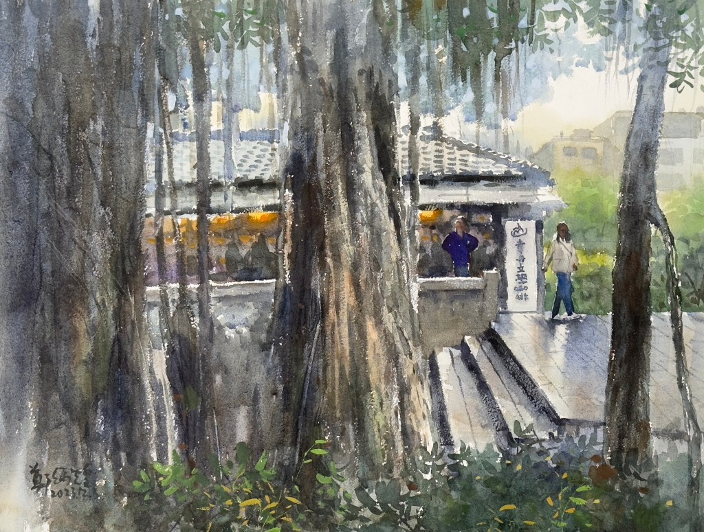 鄭炳煌 霧晨亭影 水彩 對開 2024.2.20