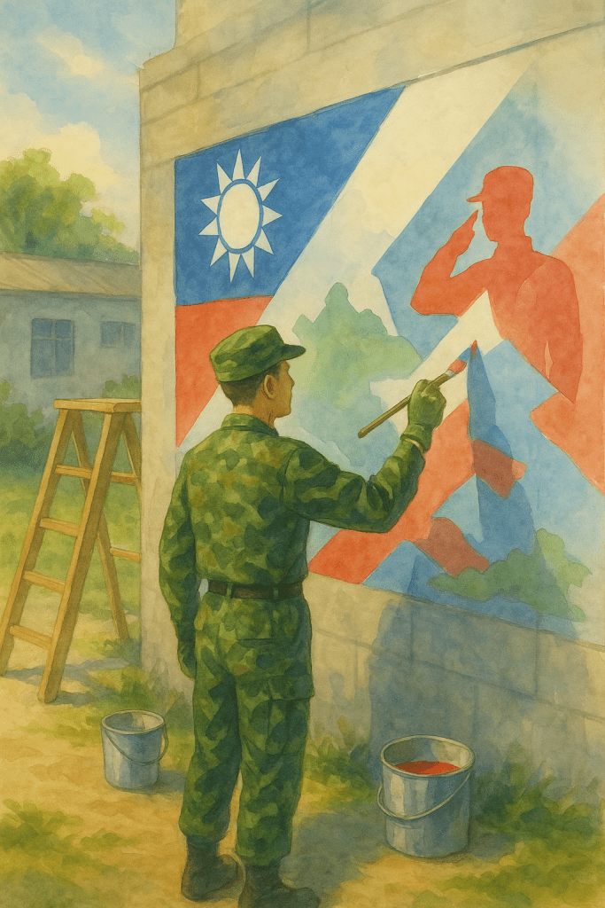 這不是正式職銜,而是對他任務性質的最好註解。從防空洞、軍事設施、古寧頭紀念館,到教育看板與宣傳牆,每一處需要圖像傳達的場域,都是他揮筆與構圖的舞台。長官以言語描述畫面意象,他便以畫筆將構想具象成景,經常畫至深夜方休,幾乎沒有明確的上下班界線。